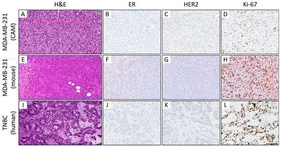 Histological (A–C) and immunohistochemical comparison of MDA-MB-231 CAM ovografts (A–D), MDA-MB-231 murine xenografts (E–H), and human TNBC tumor tissue (I–L). Representative images of the histomorphology (hematoxylin and eosin) and immunohistochemical expression profile: Expression of estrogen receptor (ER; B,F,J), human epidermal growth factor receptor 2 (HER2; C,G,K), and the proliferation marker Ki-67 (D,H,L) (magnification: x400 each). All three tumors presented a TNBC phenotype with a high-grade morphology, negativity for ER/PR (PR not shown) and HER2, and a high Ki-67 proliferation index. Of note, the mouse xenografts showed some nonspecific background staining (for higher magnification, see Supplemental Figure S4), which should not be confused with specific nuclear and membranous staining of the tumor cells. Scale bar: 100 µm (applies to both cell lines and all images).
