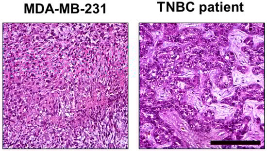Comparison of histomorphology in MDA-MD-231 CAM ovografts and TNBC patient tumor tissue. Higher magnification of the MDA-MB-231 ovograft (Figure 7A) and human TNBC case (Figure 7I). These images display tumor growth patterns similar to those observed in tumor areas of both MDA-MB-231 CAM ovografts and TNBC patient tumor tissue. In both cases, the TNBC tumor cells showed high pleomorphism and partial cord-like growth surrounded by fibromyxoid tumor stroma (hematoxylin and eosin; each at 200× magnification). Scale bar: 200 µm (applies to both cell lines).
