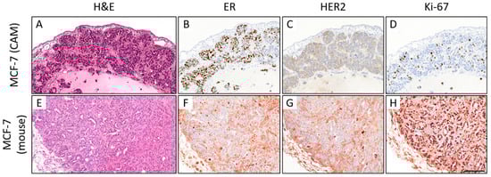 Comparison of the histomorphology (hematoxylin and eosin; H&E) and immunohistochemical expression of estrogen receptor (ER), HER2, and Ki-67 in MCF-7 CAM ovografts (A–D) vs. MCF-7 mouse xenografts ((E–H); 400x magnification each). In the CAM ovograft, rather solid growth can be observed, whereas some tubular formations can be detected in the mouse xenograft (A,E). ER expression can be detected in both grafts (B,F). Neither the ovograft nor the mouse xenograft showed HER2 overexpression. However, the Ki-67 proliferation index was higher in the mouse xenograft, which was harvested on day 76 (CAM: ovograft harvested 5 days after engraftment). Note that there is significant nonspecific background staining in the immunohistochemical slides of the mouse xenograft, which hampers the biomarker assessment (F–H). This should not be confused with a specific staining of the tumor cells (for higher magnification, see Supplemental Figure S5). Scale bar: 100 µm (applies to both cell lines and all pictures).