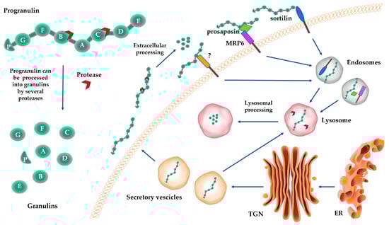 Extracellular progranulin is internalized by endocytosis and sorted into lysosomes (Figure 1). Interestingly, progranulin can also reach the lysosomes diverting from the secretory pathway [13,34] (Figure 1). In lysosomes, progranulin is processed by cathepsin L into granulins, which are quite stable in this subcellular compartment [35,36]. However, the potential lysosomal function of granulins is still elusive [35,36].