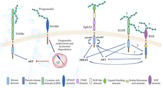 Finally, progranulin binds to both TLR9 and CpG oligonucleotides (CpG-ODNs) in immune cells and endosomes, favoring TLR9 and CpG-ODNs interaction and potentiating the innate immune response to bacterial infections [9]. Notably, it has been reported that progranulin can activate other receptor-tyrosine kinases, including members of the Eph family, such as EphA4 and EphB2 [48,59], EGFR [48,59,65], ErbB2 [48] and RYK [65]. However, it is not known whether progranulin activates these receptors by direct binding or indirectly by activating functional cross-talks.