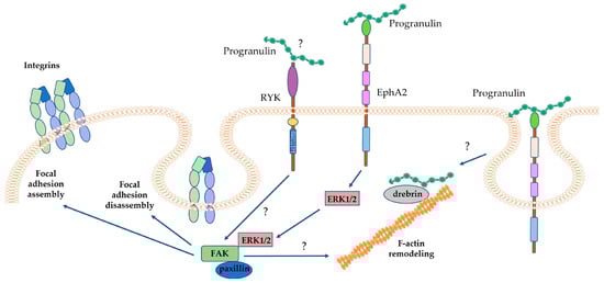 Progranulin modulates FAK activity. In bladder cancer, progranulin-dependent activation of ERK1/2 promotes the formation of a complex containing FAK, paxillin and ERK1/2, thereby promoting cell motility. In addition, in bladder cancer, progranulin interacts with the F-actin-binding protein drebrin, promoting F-actin remodeling. However, the mechanism by which progranulin interacts with drebrin is still unknown and could be dependent on receptor-mediated progranulin internalization. In mesothelioma cells, progranulin modulates the phosphorylation of FAK, affecting the dynamics of focal adhesion assembly/disassembly and F-actin remodeling. RYK action in progranulin-dependent modulation of FAK in mesothelioma is still not well defined.