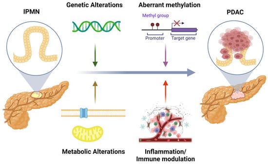 The impact of genetic, metabolic, inflammatory, and immunomodulatory mediators in progression of IPMN to PDAC. Created with BioRender.com.