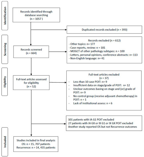 We initially identified a total of 1057 studies from the databases and additional records during the preliminary literature search. After eliminating the duplicates and screening the titles and abstracts, 52 studies were selected for full-text assessment (Figure 1). Eventually, we included 15 studies [10,11,12,13,15,18,19,20,21,22,23,24,25,26] of 707 patients in our meta-analysis (Table 1), of which 14 studies consisting of 435 patients reported outcomes for both the recurrence and mortality rate [10,11,12,13,15,18,19,20,21,22,23,25,26]. Importantly, we excluded 101 patients with stage IA G1 POIT and 27 patients with IA GX, IX G1, or IX GX diseases within these included studies. Among the included manuscripts, 14 of these studies were retrospective single-center or multicenter cohort studies, and the other one was a prospective cohort study. Literature quality evaluation revealed the moderate-to-high quality of the included cohort studies. The literature quality evaluation can be found in Table S1. The major chemotherapy regimens were BEP or bleomycin, vincristine, and cisplatin (BVP), and some patients were treated with etoposide and cisplatin (EP). Meanwhile, some studies did not clearly state the regimens or dose (Table S2).