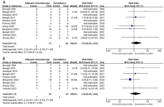 The forest plot revealed no significant difference between the stage IA G2-G3 POIT patients who received adjuvant chemotherapy or surveillance in recurrence (A) or mortality (B).