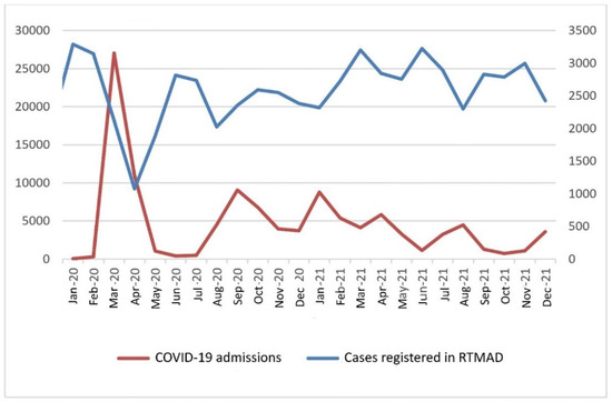 Evolution of the number of cancer diagnoses registered in RTMAD (blue line, legend right side) and the number of COVID-19 hospital admissions (red line, legend left side) during the same period (2020–2021).