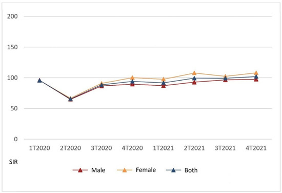 Noticeably, the recovery of the diagnostic backlog according to the standardized incidence was lower for males than females throughout the COVID-19 period. Males did not recover up to the 2019 level until the fourth trimester of 2021, while women recovered earlier in the fourth trimester of 2020. In the total population, with both genders taken together, the SIR equivalent to 2019 was reached in the second trimester of 2021. Compensating for overdiagnoses did not occur in males during the COVID-19 period analyzed, but for females it occurred in the second and fourth trimesters of 2021, coincident with the values in hospital admission of the fifth and sixth COVID-19 pandemic waves in Madrid, evidenced in Figure 1.