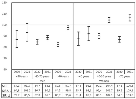 Standardized incidence ratio (SIR) of cancer diagnoses registered in RTMAD for 2020 and 2021 compared to 2019 (baseline pre-COVID-19 period) according to gender and age groups (<40 years, 40–70 years and >70 years). The SIR upper (SIR UL) and lower limits (SIR LL) of 95% confidence intervals are represented.