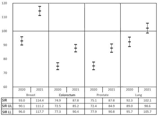 Standardized incidence ratio (SIR) of the most common cancer diagnoses registered in RTMAD for 2020 and 2021 compared to 2019 (baseline pre-COVID-19 period) according to cancer type (breast, colorectum, prostate and lung). The SIR upper (SIR UL) and lower limits (SIR LL) of 95% confidence intervals are represented.