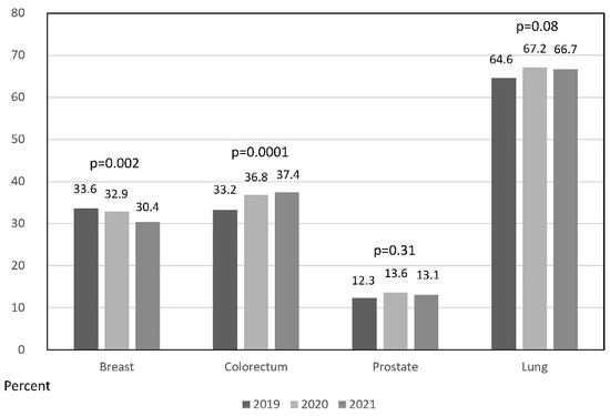 Percentage of locally advanced or metastatic cases at presentation per year during the period 2019–2021 for the most common cancer diagnoses registered in RTMAD (breast, colorectum, prostate and lung). p-values are expressed as Cochran–Armitage trend test.