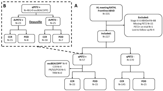 CONSORT diagram. CONSORT diagram and ultimate progression-free-survival events (for CONSORT depicting response to treatment see Supplementary Figure S1). (A) Interim PET by semi-quantitative lesion SUVmax to liver SUVmean ratio ≥ 1.3 (qPET); (B) interim PET by Deauville criteria. Inclusion criteria were modeled after the RATHL protocol (stage IIB to IV, or stage IIA with bulky disease or at least three involved sites). We excluded patients who only received four cycles of ABVD, did not undergo a PET scan after cycle 2 of ABVD, switched to any treatment other than escBEACOPP, or were lost to follow-up before the completion of therapy. Abbreviations: CCR, clinical complete response; POD, progression of disease; PR, partial response; SD, stable disease; TRM, treatment related mortality. See also Supplementary Figure S1—CONSORT diagram. * Data for patients switched to escBEACOPP are included for reference only.