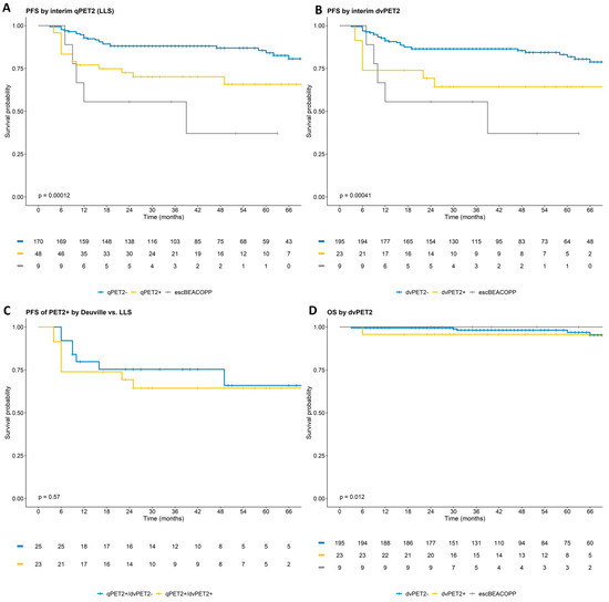 Progression free and overall survival by dvPET2 and qPET2. PFS by qPET2 (A); PFS by dvPET2 (B); comparison of PFS in patients considered qPET2+ but not dvPET2+ to those considered PET2+ by both assessments (C); overall survival by dvPET2 (not depicted 2 events at 6.5 and 8.5 years) (D). p-values calculated only for patients treated with ABVD. Patients treated with escBEACOPP are presented for reference.