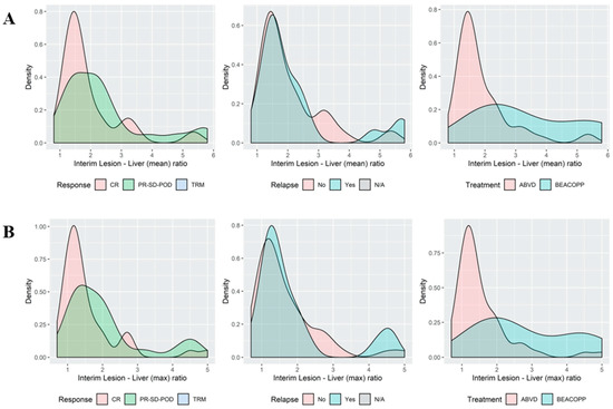 Histograms of the association between the qPET2 thresholds for the LLS ratio and outcomes histogram depicting the occurrence of cases (Y axis) at different LLS ratios. The area under the curve represents all cases. Note the overlap in ‘peaks’ at the lower LLS ratio and at the higher LLS ratios. Distribution of the interim lesion SUVmax to liver SUVmean ratio (X axis) (A) and the lesion SUVmax to liver SUVmax ratio (B), demonstrating an overlap between patients with ‘good’ (CR; no relapse) and ‘bad’ (PR-SD-POD; relapse) outcomes. For interim PET images and outcomes see Supplementary File S1.