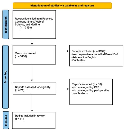 According to the defined search algorithm (see Section 2.1 and Section 2.2), a total of 3158 articles were initially identified (see Figure 1). After a review of the study titles, abstracts, and full texts, 3147 articles were excluded, leaving 11 articles eligible for the meta-analysis. These 11 articles involved a total of 1168 patients. A total of 8 of the 11 articles provided data regarding PFS, whereas 7 of the 11 articles provided data regarding perioperative complications.