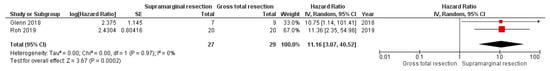 Two studies reported complete multivariate Cox regression data on PFS. Fifty-six patients were allocated into either the supramarginal resection arm or the gross total resection arm (27 vs. 29). Pooling of the results showed a significant association between supramarginal resection and progression-free survival (HR: 11.16; 95% CI: 3.07–40.52, p = 0.0002). Figure 2 shows a forest plot displaying the results of the analysis. No significant heterogeneity was present (I2 = 0%, p = 0.97).