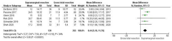 Further analysis of the median PFS times (months) in patients (n = 332) who underwent SMR (n = 130) or GTR (n = 202) was performed. All studies, except for the studies by Hamada et al. [] and Mampre et al. [], were included in this analysis. The study by Hamada et al. [] was excluded because PFS times were only reported stratified by the anatomical location (frontal, temporal, occipital, and parietal). Furthermore, Mampre et al. [] only reported the overall median time to tumor progression. Compared with GTR, SMR of GB resulted in a longer PFS of 8.44 months (95% CI: 5.18–11.70, p < 0.00001). No significant heterogeneity was present (I2 = 34%, p = 0.18). Figure 3 summarizes those results.