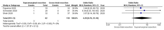 Three studies reported data regarding the incidence of postoperative meningitis in patients who underwent either SMR or GTR. One-hundred-and-seventy-two patients were allocated into either the SMR arm or the GTR arm (62 vs. 110). Three patients (3/62; 4.8%) in the SMR arm suffered from postoperative meningitis, whereas one patient had postoperative meningitis in the GTR arm (1/110; 0.9%). Pooling of the results revealed no significant difference between SMR and GTR with regard to the incidence of postoperative meningitis (OR: 4.20; 95% CI: 0.70–25.18, p = 0.12). Figure 4 shows a forest plot displaying the results of the analysis. (No significant heterogeneity was present (I2 = 0%, p = 0.95)).