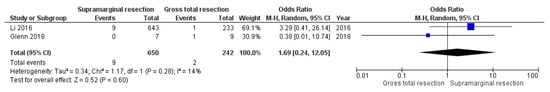 Two studies reported data regarding the incidence of postoperative intracranial hemorrhage in patients who underwent either SMR or GTR. Eight-hundred-and-ninety-two patients were allocated into either the SMR arm or the GTR arm (650 vs. 242). Nine patients (9/650; 1.4%) in the SMR arm suffered from postoperative intracranial hemorrhage, and two patients had a postoperative intracranial hemorrhage in the GTR arm (2/242; 0.8%). Pooling of the results revealed no significant difference between SMR and GTR with regard to the incidence of postoperative intracranial hemorrhage (OR: 1.69; 95% CI: 0.24–12.05, p = 0.60). Figure 5 shows a forest plot displaying the results of the analysis. (No significant heterogeneity was present (I2 = 14%, p = 0.28)).