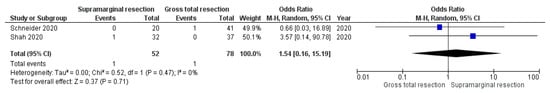 The studies were further reviewed regarding postoperative KPS and new neurological deficits. Supplementary Table S1 summarizes the current data regarding postoperative KPS and new neurological deficits in studies comparing SMR with conventional GTR. Postoperative KPS values are provided in only six studies [,,,,,], and only four [,,,] of those studies further stratified the postoperative KPS values by EOR. The study by Schneider et al. [] revealed that patients who underwent a temporal lobectomy had a significantly superior KPS at 12 months after surgery compared with patients who underwent a conventional GTR. The other three studies comparing postoperative KPS values stratified by EOR found no significant differences [,,]. Statistical analysis of the postoperative KPS was not possible because different statistical values (e.g., mean or median values with ranges or interquartile ranges) at different time points are given. The rates of new postoperative neurological deficits are described in seven studies [,,,,,,], and three of those studies describe the incidences of new postoperative deficits in patients who underwent either SMR or GTR [,,]. No significant associations between SMR or GTR with the onset of new postoperative neurological deficits were found. Statistical analysis of new postoperative neurological deficits was not possible because only one event in the study by Glenn et al. [] was observed, and the other studies comparing new neurological deficits stratified by SMR or GTR observed no events [,].