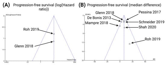 Funnel plots for the following endpoints of the present meta-analysis [,,,,,,]: probability of progression-free survival according to the multivariate Cox regression analyses (A) and probability of progression-free survival according to the mean differences of the median progression-free survival times (B).
