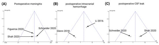 Funnel plots for the following endpoints of the present meta-analysis [,,,,]: postoperative meningitis (A), postoperative intracranial hemorrhage (B), and postoperative CSF leaks (C).