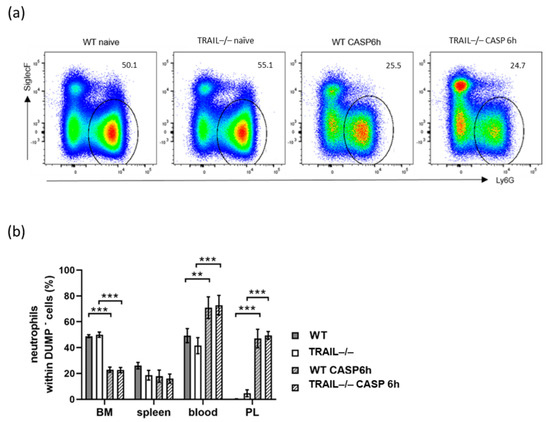 In the bone marrow (BM), the number of neutrophils was significantly decreased in septic WT mice (p < 0.0001; CASP 22.9 ± 4.5 versus naïve 49.9 ± 5.0) and septic TRAIL–/– mice (p < 0.0001; CASP 22.7 ± 4.6 versus naïve 50.0 ± 4.1) (Figure 1a,b). This effect did not occur in the spleen (Figure 1b). In contrast, the number of neutrophils in the blood and in the peritoneal lavage (PL) of septic WT (blood: p < 0.01, 79.2 ± 9.1, PL p < 0.001, 47.0 ± 16.1) and septic TRAIL–/– mice was highly upregulated (blood: p < 0.0001; 79.9 ± 7.4 versus naïve 41.5 ± 12.4, PL: p < 0.0001; 49.5 ± 6.7 versus naïve 2.6 ±3.5) (Figure 1b). No difference between WT and TRAIL–/– mice was observed in the spleen.