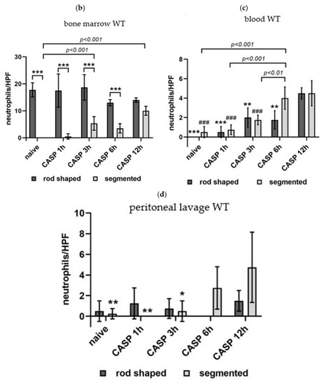The BM from naïve WT mice presented no segmented but only rod-shaped neutrophils. In CASP mice, the number of segmented neutrophils started to increase at 3 h (p < 0.01; 6.3 ± 2.7 versus 0.4 ± 0.1) to 12 h (p < 0.001 40 ± 1.6) after CASP. In parallel, the number of rod-shaped neutrophils decreased at 6 and 12 h after CASP treatment, although this effect did not reach statistical significance (13 ± 0.5 and 14 ± 0.4, respectively, versus 17.8 ± 1.3) (Figure 2b). After 1, 3, and 6 h of CASP, the BM contained significantly more rod-shaped than segmented neutrophils (p < 0.001 versus segmented). This difference was no longer pronounced after 12 h CASP.