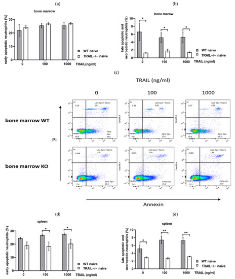 To examine the impact of TRAIL on early and late apoptosis induction, neutrophils isolated from the BM and spleen of naïve WT and TRAIL–/– mice were challenged with different concentrations of recombinant TRAIL in vitro for 1 h. In neutrophils isolated from the BM, TRAIL had no significant impact on early apoptosis. No difference was observed between TRAIL–/– and WT (Figure 3a). In contrast, neutrophils derived from the BM of TRAIL–/– mice showed less late apoptosis and necroptosis compared with the WT (p < 0.05) (Figure 3b). In vitro challenging with recombinant TRAIL did not stimulate apoptosis either in TRAIL–/– or in WT neutrophils (Figure 3b). In addition, splenic neutrophils derived from TRAIL–/– mice showed fewer early (p < 0.05) (Figure 3c) and late apoptotic or necroptotic cells (p < 0.01) compared with the WT (Figure 3d). Again, recombinant TRAIL did not significantly stimulate apoptosis in vitro (Figure 3c,d).
