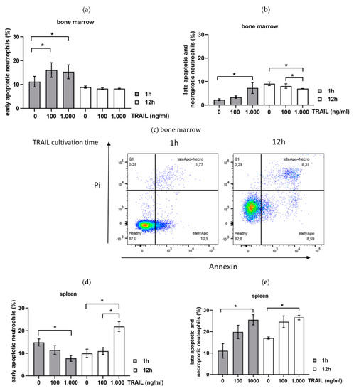To investigate the impact of TRAIL on the background of sepsis, neutrophils of the BM and spleen were isolated 6 h after CASP induction from WT mice and stimulated with different TRAIL concentrations for 1 h or 12 h in vitro. Neutrophils derived from the BM of septic mice showed a high response to TRAIL in the phase of early apoptosis after 1 h of TRAIL stimulation (p < 0.05; TRAIL 100 ng/mL 16.1 ± 3.1%; TRAIL 1000 ng/mL 15.3 ± 2.9% versus TRAIL 0 ng/mL 11.2 ± 2.0%) (Figure 4a). More prolonged stimulation with TRAIL up to 12 h diminished this substantial effect of TRAIL on early apoptosis induction (Figure 4a). The same effect was observed on late apoptosis induction in BM neutrophils (p < 0.05; TRAIL 1000 ng/mL 7.3 ± 4.1 % versus TRAIL 0 ng/mL 2.3 ± 0.8%) (Figure 4). Interestingly, when analyzing the effect of TRAIL in neutrophils of the spleen, we found an initial decrease in early apoptotic cells after 1 h TRAIL challenge (p < 0.05; TRAIL 1000 ng/mL 7.7 ± 2.3% versus TRAIL 0 ng/mL 14.8 ± 4.8%) (Figure 4c). However, stimulation with 1000 ng/mL TRAIL for 12 h increased the number of early apoptotic neutrophils (p < 0.05; TRAIL 100 ng/mL 10.7 ± 2.2%, TRAIL 1000 ng/mL 21.9 ± 3.2% versus TRAIL 0 ng/mL 9.0 ± 1.9%) (Figure 4c). In addition, late apoptosis and necroptosis were significantly increased by 1000 ng/mL TRAIL in neutrophils of the spleen after 1 and 12 h (p < 0.05; 1 h TRAIL 1000 ng/mL 25.6 ± 3.3%; 12 h TRAIL 1000 ng/mL 26.6 ± 0.6% versus TRAIL 0 ng/mL 12.9 ± 1.1%) (Figure 4d).