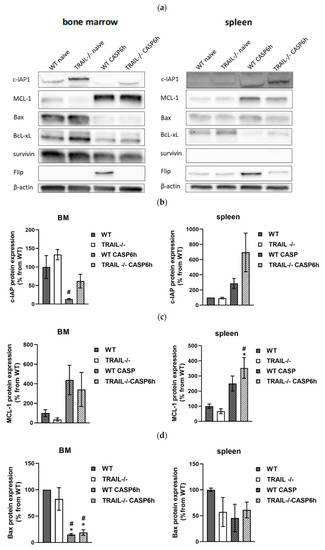 No significant difference in protein expression was detected for Bcl-xL (Figure 5e). Survivin expression was found only in neutrophils of the BM but not in the spleen (Figure 5a,e). Survivin expression in the BM was not changed by CASP or TRAIL deletion (Figure 5e).