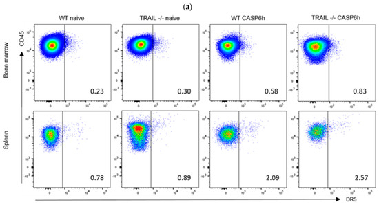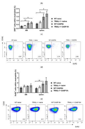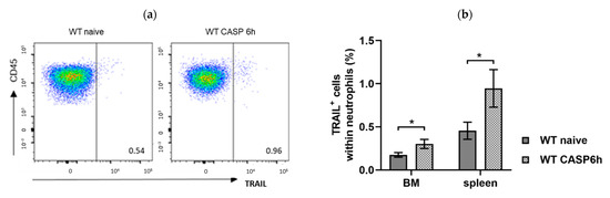 To analyze the role of TRAIL in CASP-induced sepsis, we compared the expression of TRAIL in neutrophils derived from the BM and spleen of naïve and septic (6 h CASP) WT mice by FACS (Figure 6a). We observed a significant increase of TRAIL-positive neutrophils in septic mice in the BM (p < 0.05; 0.3 ± 0.1% versus naïve 0.2 ± 0.1%) and spleen (p < 0.05; 1.0 ± 0.5% versus naïve 1.1 ± 0.9%) compared with naïve mice (Figure 6b).