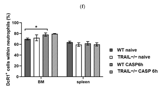 TRAIL-receptor DR5, the only TRAIL receptor with a functional death domain in mice, was significantly upregulated in neutrophils of the BM (p < 0.01; Figure 7a,b) and spleen (p < 0.05; Figure 7a,b) of septic WT mice (6 h CASP) compared with naïve mice. The same effect was observed in TRAIL–/– mice (p < 0.05; Figure 7a,b). No difference was detected between septic TRAIL–/– mice and septic WT mice or naïve TRAIL–/– mice and naïve WT mice (Figure 7b). In addition to anti-apoptotic proteins, neutrophils develop resistance to TRAIL by expressing decoy receptors, and we demonstrate organ-specific expression of decoy receptors in sepsis. The DcR2 receptor was significantly upregulated in neutrophils of the spleen of septic WT mice (p < 0.05; Figure 7c,d). Although CASP increased DcR2 expression in TRAIL-deficient mice, this failed to show statistical significance (Figure 7d). In neutrophils of the BM, no changes in DcR2 expression were observed (Figure 7d). The DcR1 receptor was slightly upregulated in neutrophils derived from the BM of septic WT mice (p < 0.05; Figure 7e,f) but not in TRAIL–/– mice. In the spleen, DcR1 expression did not change (Figure 6f).