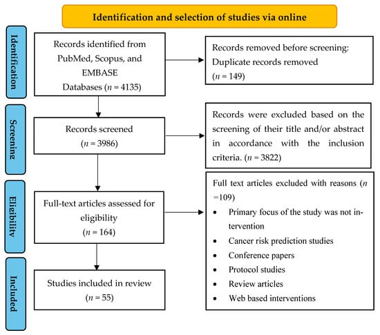 The electronic databases’ search yielded a total of 4135 articles from PubMed (n = 564), EMBASE (n = 587), and Scopus (n = 2984). After removing duplicates, 3986 articles were assessed based on their titles and abstracts. Among these, 3822 were excluded because they did not meet the inclusion criteria exclusively. The remaining 164 articles underwent full-text screening, and 109 were subsequently excluded for different reasons, such as being non-intervention studies, cancer risk prediction studies, conference papers, protocol studies, review articles, and web-based interventions (see Figure 1). Ultimately, a total of 55 studies were included in this analysis.