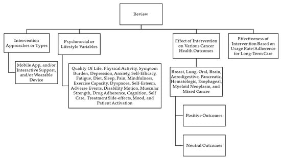 The primary objectives of this review were: (1) to explore published studies that used mobile-based interventions among cancer patients, (2) to investigate research trends and provide recommendations for the adherence and usage of mobile-app-based interventions for cancer care management, and (3) to examine the effectiveness of mobile-app-based interventions on cancer health outcomes. Hence, this analysis classified mHealth studies into various subcategories depending on the type of intervention strategies, lifestyle factors, and their impact on health outcomes for diverse cancer types and its usage rate or adherence for cancer care management. Additionally, the secondary objective of this review was to develop a taxonomy of mobile-app-based interventions for app developers and healthcare researchers that could assist in the development of future mHealth cancer care solutions.