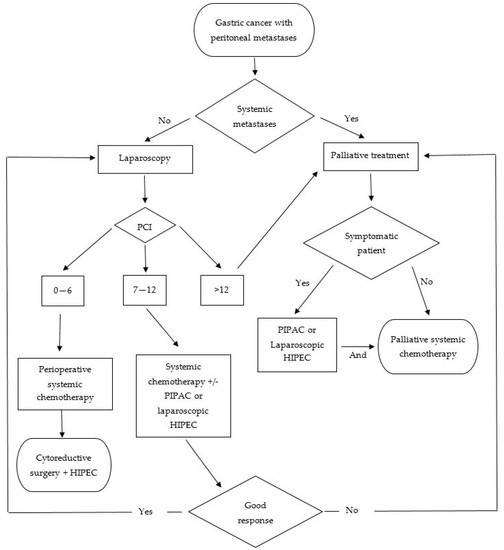 The treatment of PM of GC origin is complex and aggressive, with limited results; therefore, the correct identification of patients is essential to choose the appropriate treatment for each one. When a patient is diagnosed with GC with PM, it is essential to assess the extent of the disease. The volume of peritoneal disease must be carefully evaluated to identify those patients that are potentially curable; diagnostic laparoscopy is required to establish this peritoneal disease extension using the peritoneal cancer index (PCI) [38]. The abdominal cavity is divided into 13 anatomical regions, and each area is given a value from 0 to 3, based on the volume of peritoneal disease in that region; therefore, a numerical value is set, ranging from 0 to 39.