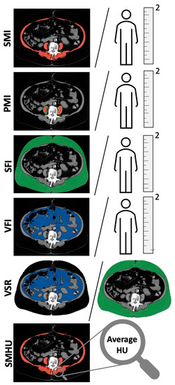 - Mourtzakis, M.; Prado, C.M.M.; Lieffers, J.R.; Reiman, T.; McCargar, L.J.; Baracos, V.E. A practical and precise approach to quantification of body composition in cancer patients using computed tomography images acquired during routine care. Appl. Physiol. Nutr. Metab. 2008, 33, 997–1006. [Google Scholar] [CrossRef]