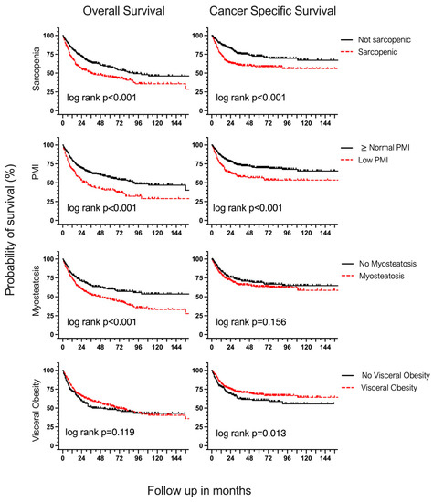 - Martin, L.; Birdsell, L.; MacDonald, N.; Reiman, T.; Clandinin, M.T.; McCargar, L.J.; Murphy, R.; Ghosh, S.; Sawyer, M.B.; Baracos, V.E. Cancer cachexia in the age of obesity: Skeletal muscle depletion is a powerful prognostic factor, independent of body mass index. J. Clin. Oncol. 2013, 31, 1539–1547. [Google Scholar] [CrossRef]