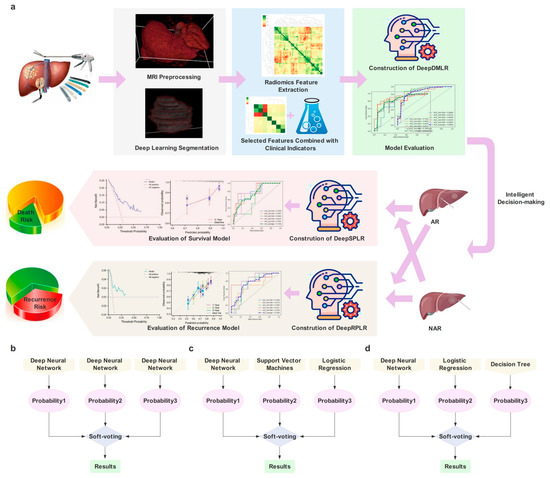 (a) is the workflow of this study; (b–d) represent the architecture of the proposed models, including the Deep Model of Decision-making in Liver Resection (DeepDMLR), the Deep Model of Survival Prediction about Liver Resection (DeepSPLR), and the Deep Model of Recurrence Prediction about Liver Resection (DeepRPLR), respectively.