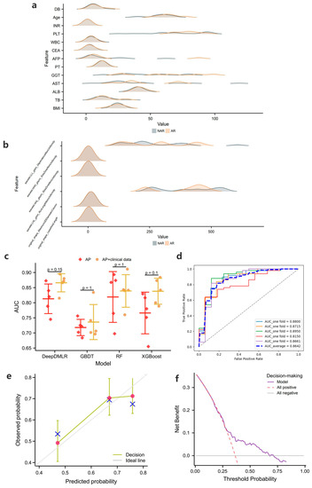 The results of the 5-fold cross validation are shown in Figure 3c, from which it can be concluded that the average performance of DeepDMLR (the highest AUC = 0.8642) was better than that of GBDT (the highest AUC = 0.7347), RF (the highest AUC = 0.8375) and XGBoost (the highest AUC = 0.8373). The model effects after inputting AP with the clinical baseline were generally better than those after inputting AP only, which provides a basis for exploring the superior feature representation. Figure 3d and Figure S5 show the receiver operating characteristic curves (ROCs) of DeepDMLR inputting AP + clinical features and other models, respectively. In addition, the calibration curve (Figure 3e) and DCA (Figure 3f) of the best-performing model were also displayed. A strong match between true and predicted probabilities was observed from the calibration curve, and a good net clinical benefit was found from the DCA.