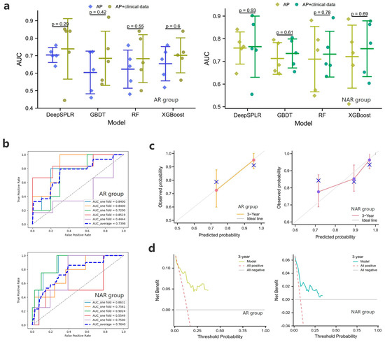 For the OS prediction within 3 years after surgery, Figure 4a shows the 5-fold cross-validation results of the four models, and it can be found that DeepSPLR shows the most superior performance in both the AR and NAR groups. The average AUCs of DeepSPLR inputting AP and AP + clinical features in the NAR group (0.7590 and 0.7640) were higher than those in the AR group (0.7048 and 0.7398), respectively. Based on this, we found that the model worked better when the input was AP with clinical data, compared to when the input was AP only. Figure 4b, Figures S6 and S7 represent the ROC curves of DeepSPLR inputting AP + clinical data and other models in the AR and NAR groups. To further demonstrate the performance of the proposed model, Figure 4c,d represents the calibration curves and DCAs of DeepSPLR after inputting the combined features.