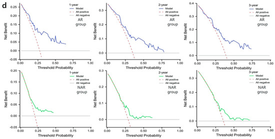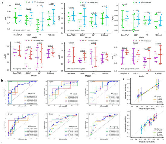 The results of the RFS prediction are shown in Figure 5a, and it can be seen that the proposed DeepRPLR outperformed the other comparable models in both the AR and NAR groups. Among them, the best-performing DeepRPLR had AUCs of 0.8258, 0.7533, 0.7364 within 1, 2, 3 years after AR and 0.7463, 0.7320, 0.7334 after NAR, respectively. Similarly, the performance of input-combined features was superior to that of inputting radiomic features alone. The ROC curves for all the models are shown in Figure 5b and Figures S8–S13, where the best performing models (DeepRPLR inputting AP + clinical data) were selected and their calibration curves and DCAs were plotted (Figure 5c,d) to reflect the prediction accuracy of the models.