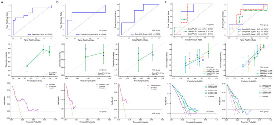 (a) denotes the performance of DeepDMLR in the external validation cohort, including its ROC curve, calibration curve and DCA; (b) indicates the performance of DeepSPLR for the AR and NAR groups in the external validation cohort, including their ROC curves, calibration curves and DCAs; (c) indicates the performance of DeepRPLR for the AR and NAR groups in the external validation cohort, including their ROC curves, calibration curves and DCAs.