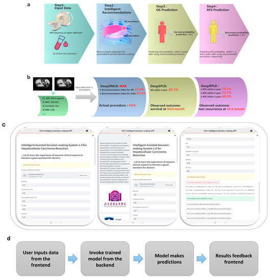 The challenges encountered during implementation included the difficulty of training the models and optimizing the parameters. In addition, some skills were needed to get the models to converge quickly. Additionally, model deployment required a stable server, which is a challenge for cloud computing platforms. Based on the offline training and external validation described above, the surgical-procedure-assisted decision-making system for HCC was designed to automatically and end-to-end perform online procedure recommendations and prognosis (OS and RFS) predictions after adoption of the recommended option for each patient. The workflow of the system consists of four steps (e.g., Figure 7a). In Step 1, the physician simply enters the patient’s upper abdominal MRI sequence and the specified 16 clinical feature values. In Step 2, the patient’s procedure (AR or NAR) is recommended, and the recommendation factor is calculated. In Step 3, the probability of OS within 3 years after the adoption of this procedure is output. In the final step, the probability of RFS within 1, 2, and 3 years after the patient chooses this procedure is output. The recommended procedure can assist the doctor’s decision making, and the probability of prognosis prediction can reflect the effectiveness of this protocol. We randomly selected a patient from the ZCH cohort and fed it into an assisted decision-making system to assess its reliability, as shown in Figure 7b. Encouragingly, the recommended procedure was consistent with what was actually used, and the predicted prognostic outcomes was the same as that of follow-up records. Based on this, an application web server was deployed at http://43.143.246.77:8502, accessed on 1 March 2023, which can be accessed through the user’s computer or smartphone (the interface of the system is shown in Figure 7c). It enables end-to-end assisted surgical decision making and prognosis prediction and is user friendly, allowing surgeons to do so with just one Internet-connected device (Figure 7d shows the main structure of the proposed system). In the future, more clinical validation will be conducted to evaluate the accuracy and utility of the system.