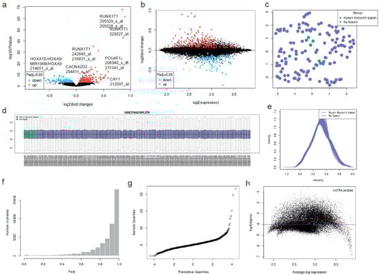 GSE37642 dataset analysis between RUNX1/RUNX1T1 fusion and RUNX1 AML patients. (a) The volcano plot depicts the statistical significance (−log10 p-value) against the magnitude of change (log2 fold change) across the differentially expressed genes in adult RUNX1/RUNX1T1 AML patients. Highlighted genes are significantly deregulated (adj. p-value ≤ 0.05) (red = upregulated, blue = downregulated). (b) The mean difference (MD) plot displays the log2 fold change versus the average log2 expression of the differentially expressed genes in adult RUNX1/RUNX1T1 AML patients. (c) UMAP clustering shows that adult AML samples are related to each other irrespective of the RUNX1/RUNX1T1 fusion. (d) Distribution of the log transformed and normalized gene expression values and density curves (e) across all adult AML samples. The median-centered values indicate that the data are normalized and cross-comparable. (f) The histogram depicts the distribution of the p-values. (g) Moderated t-statistic quantile-quantile (q-q) plot. (h) Mean-variance trend plot, in which each dot represents a gene, and it shows the mean–variance relationship of the genes in the dataset. The blue line is constant variance approximation.