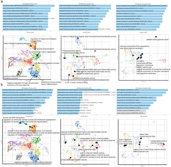 In contrast, the bottom 50 DEGs were highly enriched in membrane depolarization during cardiac muscle cell action potential, regulation of ventricular cardiac muscle cell membrane repolarization, cardiac muscle cell contraction, and regulation of cardiac muscle cell membrane repolarization (GO-BP). Furthermore, they were enriched in phosphatidylinositol 3-kinase regulatory subunit binding, voltage-gated calcium (and sodium) channel activity involved in cardiac muscle cell action potential, ankyrin repeat binding, and phosphatidic acid transfer activity (GO-MF), as well as in sperm flagellum and 9 + 2 motile cilium (GO-CC) (Table S6 and Figure 4).