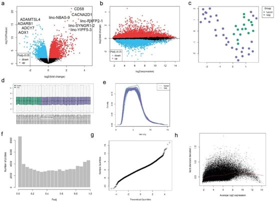 GSE75461 dataset analysis between RUNX1/RUNX1T1 fusion and RUNX1 AML patients. (a) The volcano plot depicts the statistical significance (−log10 p-value) against the magnitude of change (log2 fold change) across the differentially expressed genes in pediatric RUNX1/RUNX1T1 AML patients. Highlighted genes are significantly deregulated (adj. p-value ≤ 0.05) (red = upregulated, blue = downregulated). (b) The mean difference (MD) plot displays the log2 fold change versus average the log2 expression of the differentially expressed genes in pediatric RUNX1/RUNX1T1 AML patients. (c) UMAP clustering discriminated RUNX1/RUNX1T1-positive from RUNX1/RUNX1T1-negative pediatric AML samples. (d) Distribution of the log transformed and normalized gene expression values and density curves (e) across all pediatric AML samples. The median-centered values indicate that the data are normalized and cross-comparable. (f) The histogram depicts the distribution of the p-values. (g) Moderated t-statistic quantile-quantile (q-q) plot. (h) Mean-variance trend plot, as explained above.