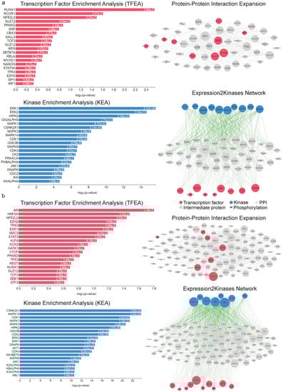 Upstream regulatory networks for the up- (a) and downregulated (b) genes in pediatric RUNX1/RUNX1T1 AML patients (GSE75461 dataset).