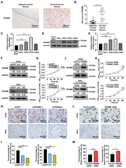 To ascertain the function of PRAME knockdown on the growth of cervical tumor cells, PRAME-silenced C33A and SiHa cells were constructed through two sets of shRNA sequences, and the transfection efficiency was verified via Western blotting and qRT-PCR. As illustrated in Figure 1F and Figure S1B, PRAME was successfully silenced in shPRAME-1 and shPRAME-2 C33A cells and SiHa cells. Cell viability and growth were impaired in PRAME-knockdown C33A and SiHa cells compared with the control groups, as detected via the CCK-8 assay (Figure 1G) and the BrdU cell proliferation assay (Figure 1H,I), respectively. Moreover, PRAME-overexpressed C33A and SiHa cells were successfully constructed in the same way (Figure 1J and Figure S1C). In keeping with the above results, cell viability and proliferation were significantly increased in PRAME-overexpressed C33A and SiHa cells (Figure 1K–M).