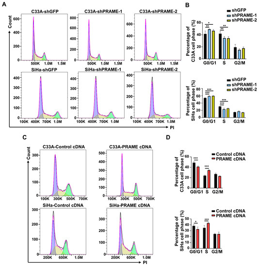 The cell cycle distribution of PRAME-knockdown and -overexpressed cells was assessed with PI staining by using flow cytometry, and cell cycle profiles were fitted by Flowjo software. As shown in Figure 2A,B, PRAME-knockdown cells were arrested more in the G0/G1 phase than the corresponding control cells. Relatively, a lower percentage of S phase cells was in the PRAME-knockdown groups compared with that in control groups. Consistently, PRAME overexpression reduced the arrest of the G0/G1 phase in C33A and SiHa cells, and the percentage of S phase was increased in PRAME-overexpressed C33A and SiHa cells compared with controls (Figure 2C,D). These revealed that PRAME-knockdown interfered with the progression of the cell cycle, while the overexpression of PRAME reduced the G0/G1 phase arrest.