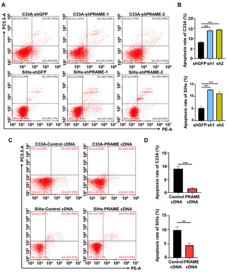 In order to evaluate the effect of PRAME on cervical cancer cell apoptosis, PRAME-knockdown and -overexpressed C33A and SiHa cells were stained with PE and 7-AAD to detect the percentage of apoptotic cells. Flow cytometry revealed that the proportion of apoptotic cells was increased when PRAME was downregulated in C33A and SiHa cells (Figure 3A,B), while it was reduced when PRAME expression was upregulated (Figure 3C,D).